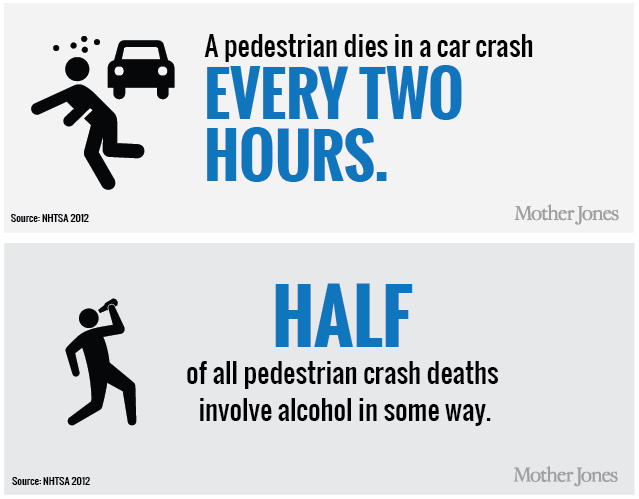 As the basis for her reporting, Oatman used some well worn stats from the National Highway Traffic Safety Administration. In a recent report, NHTSA noted that about a third of pedestrians killed while walking had blood alcohol content of .08 percent or higher at the time. That spurred a victim-blamey, click-baity frenzy in the national media about the dangers of “drunk walking” — as if people on two feet have the same responsibility to remain sober as people operating heavy machinery.