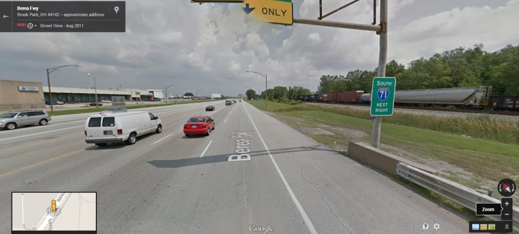 It will be hard to top the example below, however. That’s an actual bus stop in Cleveland. The only indication is a very small RTA logo under the highway sign for 71 South (you might have to zoom in to actually spot it). What exactly people are supposed to do when they get off the bus here is unclear, but it’s a sorry statement about how seriously Ohio DOT takes bus riders’ needs.
