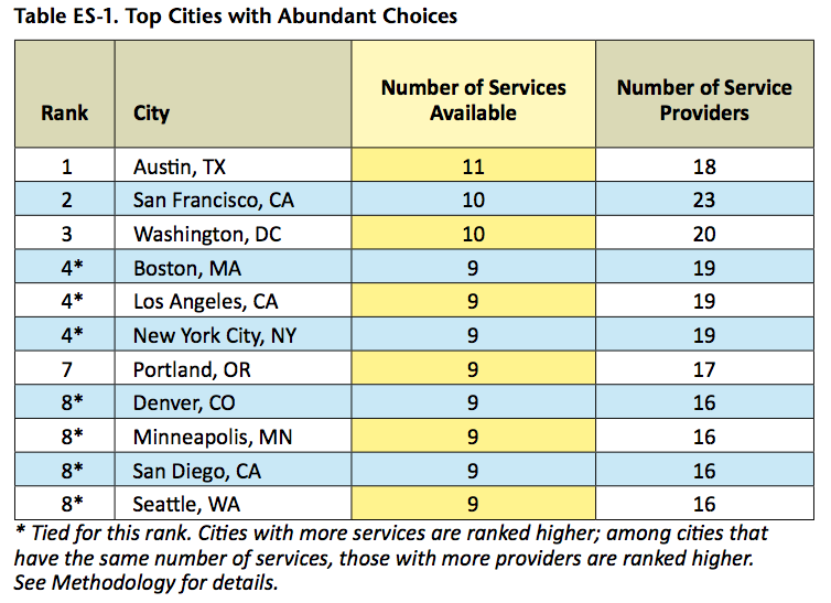 A total of 19 cities have what PIRG and Frontier referred to as “abundant choices” — at least eight of the 11 technologies. These cities are home to a combined 28 million people and tend to skew younger, with greater access to the internet.