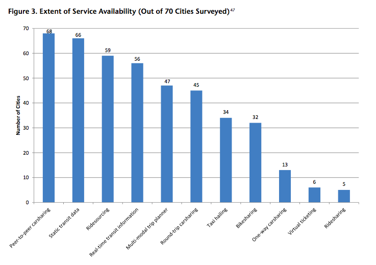 The research team examined the availability of 11 types of technology-assisted transportation — like real-time transit information, ride-hailing services, virtual ticketing, multi-modal trip-planning apps, and bike-share — in 70 U.S. cities.
