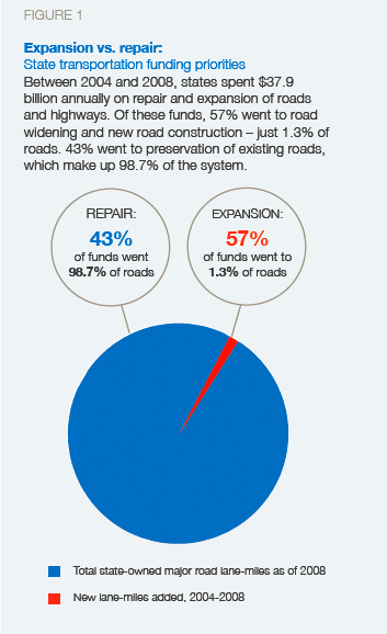 State DOTs’ lack of fiscal discipline is nothing short of criminal. The chart on the right, courtesy of Smart Growth America, shows how states divided spending between new construction and maintenance from 2004 to 2008. States used most of their money — 57 percent — on new construction (projects like that massive but oddly empty interchange in Milwaukee, above, don’t come cheap). Meanwhile, states used the 43 percent left over to maintain the remaining 98.7 percent of road infrastructure. This is a recipe for ruin.