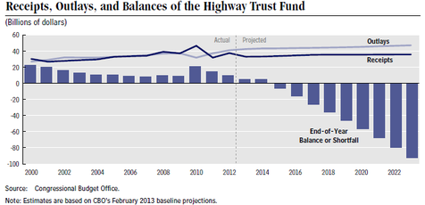 As inflation and increasing fuel efficiency have eaten away at the federal gas tax (which hasn’t been raised since 1993), the Highway Trust Fund — America’s main source of transportation funding — has been slowly going broke. Since 2008, the federal government has poured $62 billion into bailing out the fund. It currently only generates about $34 billion a year, while federal transportation spending has been closer to $50 billion.