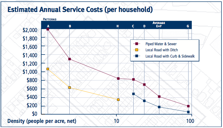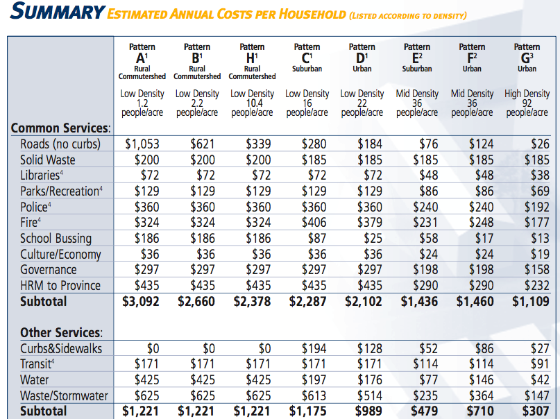 Halifax found the cost of administering services varied directly in proportion to how far apart homes were spaced. On the rural end, each house sat on a 2.5 acre lot. On the very urban end, there were 92 people dwelling on each acre. Between those two extremes were several development patterns of varying density.