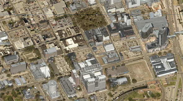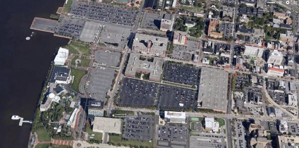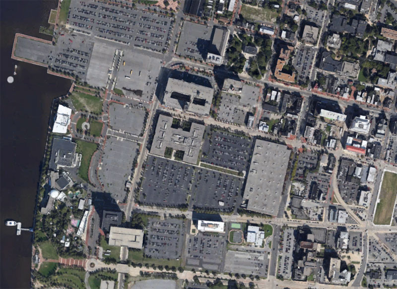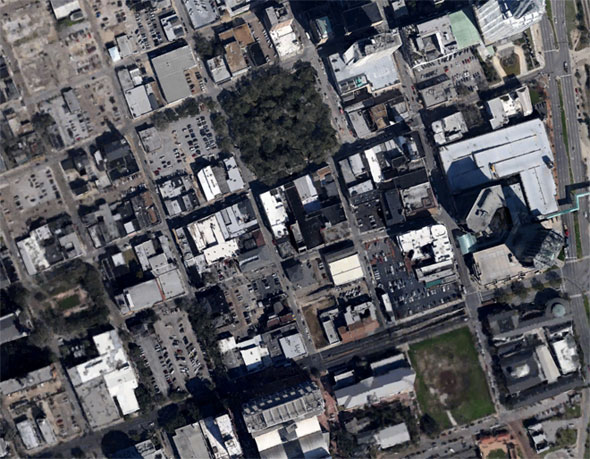 Then, just to the north: Downtown Mobile. It’s hard to choose my favorite parking lot, but if forced I’d say it’s the one abutting Bienville Square’s (the green block) western edge. Great use of a city square!