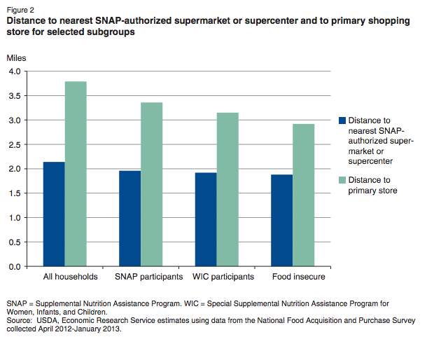 In a somewhat surprising finding, people don’t shop at the closest grocery store, by and large. The average household traveled 3.79 miles to their primary grocery, even though the closest store was 2.14 miles way. This was true, with little variation, across all income groups. USDA says this indicates shoppers are sensitive to price, quality, and selection in addition to proximity.