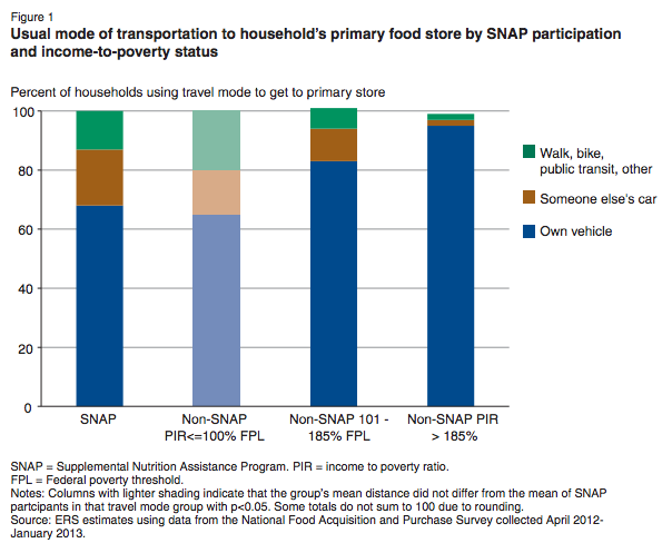 Among people who collect SNAP benefits, 68 use their own car to drive to the store, compared to 95 percent of households that earn too much to qualify for SNAP.