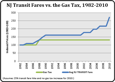While the gas tax hasn’t budged since 1988, New Jersey transit riders got stuck with a 25 percent bus fare hike and a 10 percent rail fare hike in 2010.