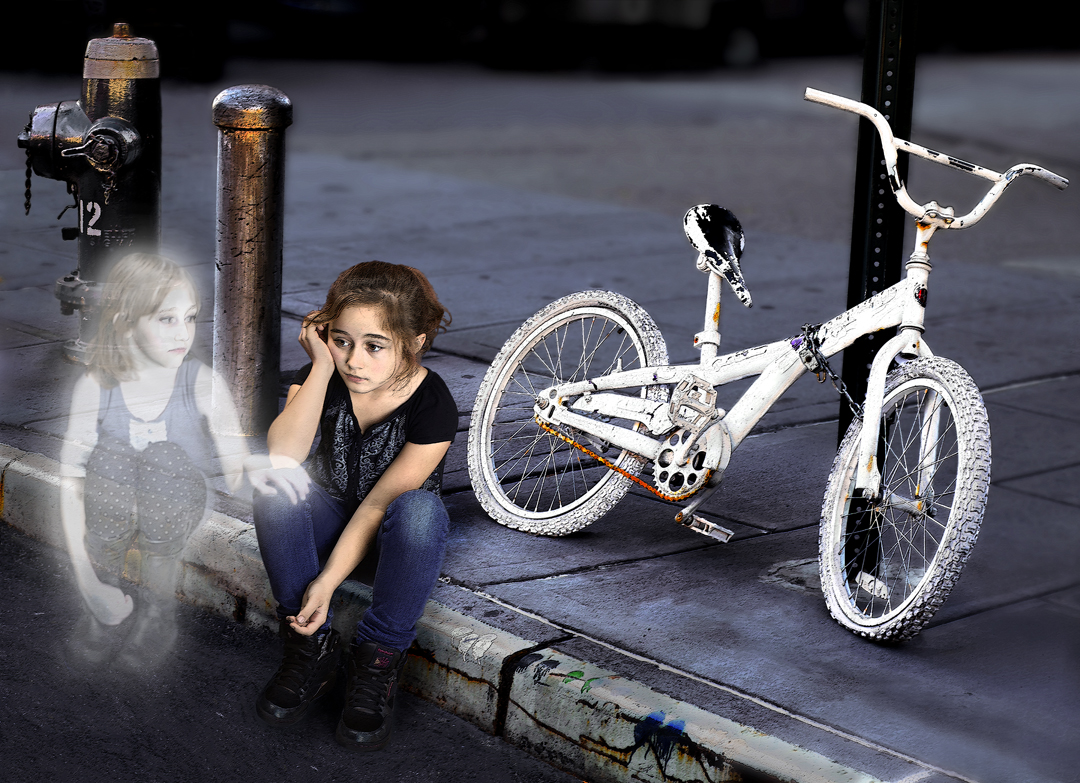 The people in the pictures are not those who actually died. “The premise behind that is the representation that it could be anybody,” Barnes said in an interview. In a few cases, like the photo above, she tried to approximate a match, but even there the models are a 6- and 8-year-old girl, and the child killed on that spot in Brooklyn Heights was an 8-year-old boy, Alexander Toulouse.