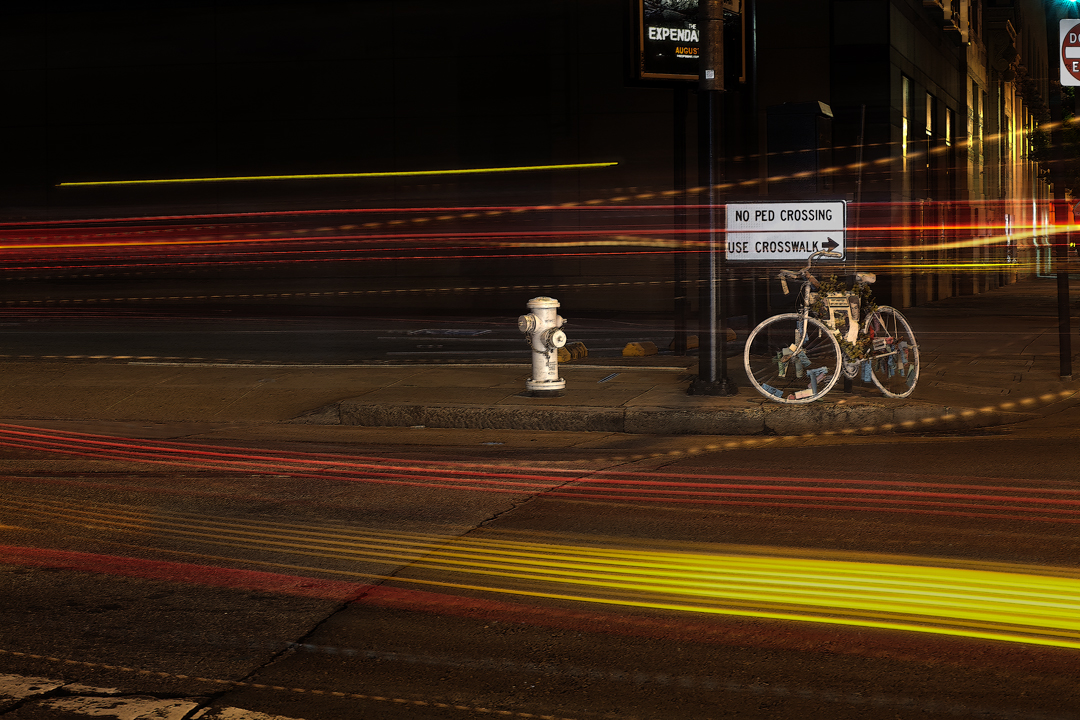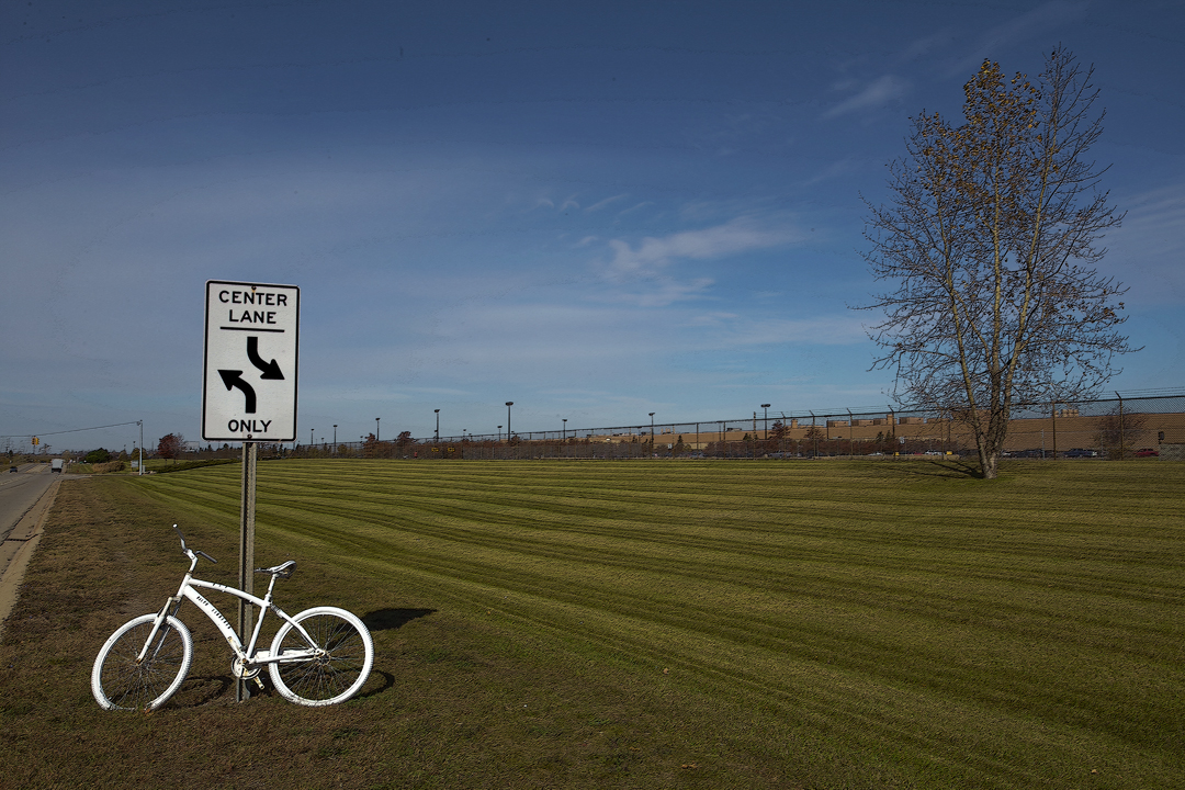 Not surprisingly, Barnes says most of the ghost bikes were located along “long stretches of road out in the boonies” and “really big, crazy intersections” — places designed for danger, unsafe for bicyclists, pedestrians, and people in cars. At the intersection of West Armitage and North Kedzie in Chicago, Barnes found two ghost bikes kitty-corner from each other. While researching places for a permanent ghost bike installation in San Francisco, Barnes found that the sites with multiple bicyclist deaths, like the corner of Franklin and Oak, were big intersections of streets with three lanes in each direction and no bike lanes in sight.