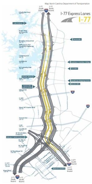 I-77 has a carpool lane running in each direction from the I-277 spur into Uptown Charlotte, and extending 26 miles north to Mooresville. The state Department of Transportation has a plan to convert those carpool lanes into tolled express lanes that would be available for solo drivers while remaining free for carpoolers. These are sometimes called HOT (High Occupancy/Tolled) lanes.