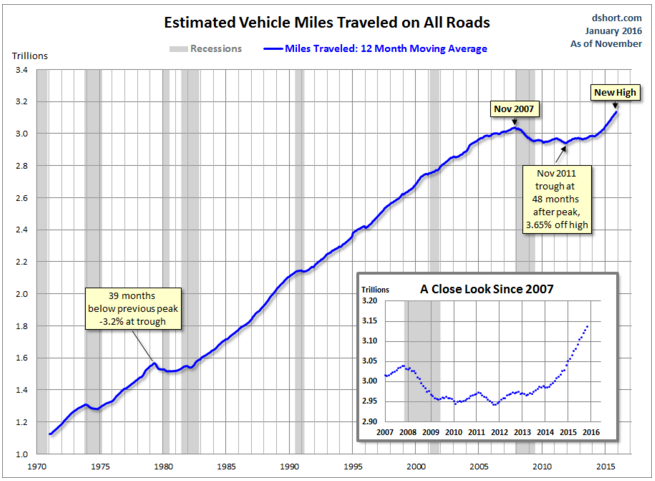 Newly released U.S. DOT data shows that through the end of November, Americans drove a cumulative 2.88 trillion miles last year, well above the same period in 2014, indicating that 2015 will set a new national record for driving mileage. Adjusting for population growth, driving is still about 6 percent lower than the peak in 2005, though that metric is also on the rise, reports analyst Doug Short.