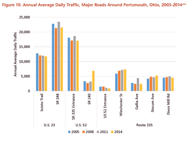 Building a new road is out of step with recent trends in Scioto County: Vehicle-miles traveled in the county fell an average of 0.2 percent a year from 2004 to 2014, according to state DOT data. Traffic on the roads that would be bypassed by the new highway has been stagnant for nearly a decade.