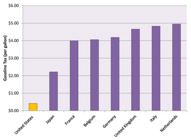 Meanwhile, Tony Dutzik at the Frontier Group notes that even if this passes, the U.S. would still have by far the lowest fuel tax rate in the industrialized world (top chart).