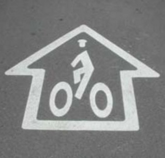 I thought at that time of a sign to define that bicyclists were intended users of the road and define lane position and to confirm that jurisdictional agencies understood that bicyclists would be using the road there. We came up with a design that had the bicycle symbol, the bicyclists with the wheels, inside an arrow outline and it was quickly called the bike in the house with the man jumping barrels at home.