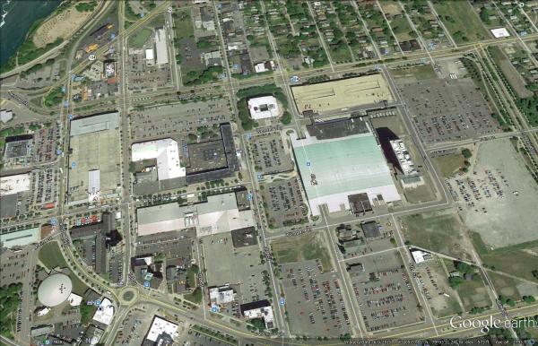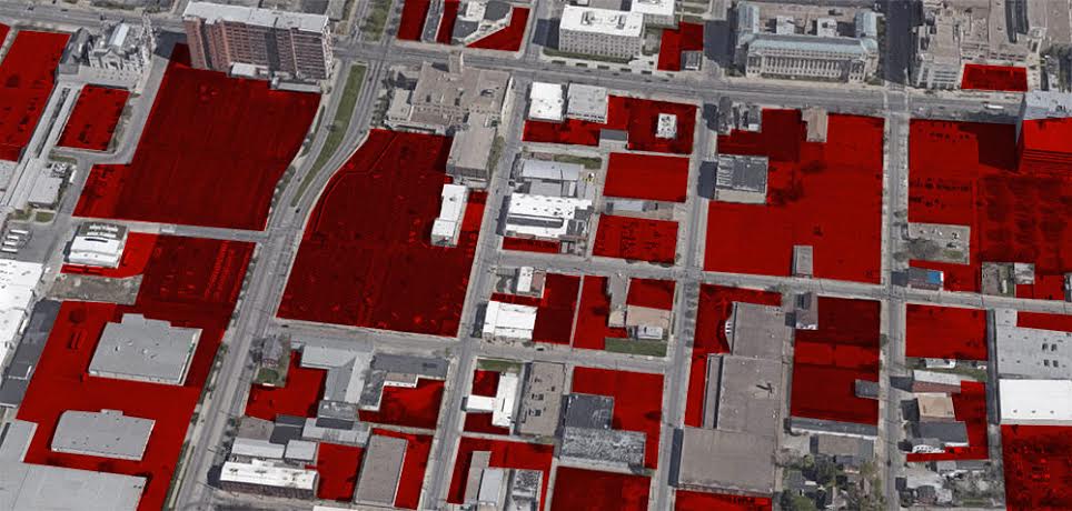 Niagara Falls’ population peaked in 1960 and has since fallen by more than half, to about 50,000. The proliferation of parking lots reflects not only the car-based transportation policies of the second half of the 20th Century, but a vicious feedback loop in which low land values discourage development. Citywide about 14 percent of building are vacant, according to the New York State Comptroller [PDF].