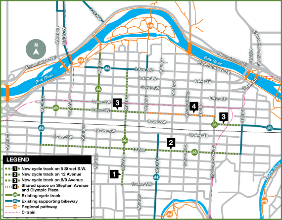The city is Calgary, Alberta. The secret is that it piloted a connected downtown network of low-stress bike routes all at once.