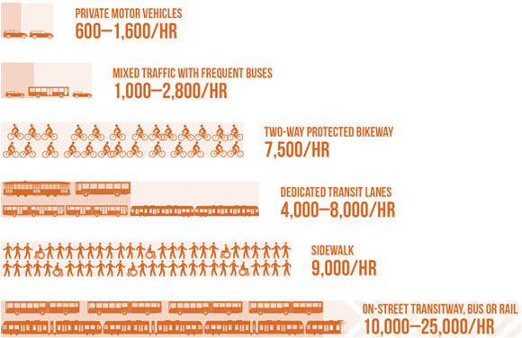 This graphic from the new NACTO Transit Street Design Guide provides a great visual answer. (Hat tip to Sandy Johnston for plucking it out.) It shows how the capacity of a single lane of traffic varies according to the mode of travel it’s designed for.