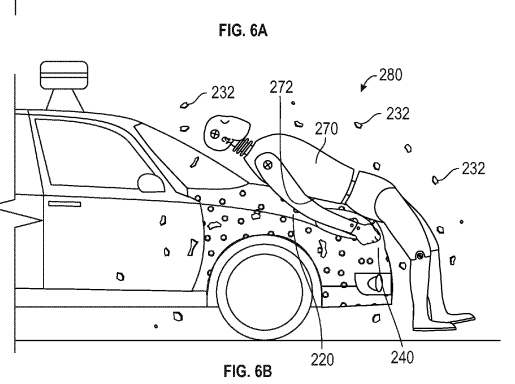 The tech behemoth was awarded a patent this week for what it describes as a “flypaper or double-sided duct tape”-type substance beneath an “eggshell” exterior on the hood of the car. In a collision with a human being, the shell would crack and the person would stick to the adhesive. The idea is that after the initial collision, the flypaper will prevent people from hitting the asphalt or getting run over, which is how severe injuries are often inflicted.