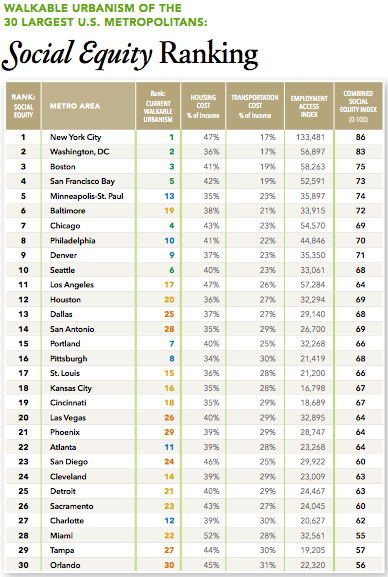 SGA ranked the 30 largest American regions according to the share of rental housing, office space, and retail located in areas with high Walk Scores. Then, using data from the Center for Neighborhood Technology, each region was also assigned a “social equity index” score based on housing and transportation costs for moderate-income households, as well as the number of jobs residents can access.