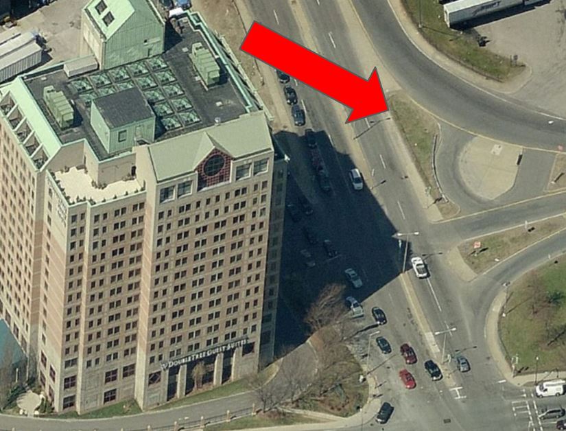 This bus stop is next to one of Boston’s largest hotels, the 300+ room DoubleTree and its award-winning jazz club. People who work, stay, or visit have to brave crossing several lanes of chaotic traffic to take the bus. The stop is on a median island surrounded by on- and off-ramps to the Mass Pike (I-90). and the 5-lane Cambridge Street which has no crosswalks and no curb cuts. There is no shelter from the elements and in the winter snow gets plowed onto the sidewalk which is never shoveled.
