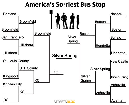 The last match in the 16-entry tourney was a bit of a blowout, with Silver Spring racking up more than 850 votes compared to about 200 votes for the other finalist, an unmarked, shelterless bus stop serving Kauffman Stadium in Kansas City.