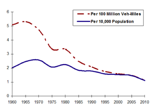 Even though the U.S. traffic fatality rate per mile driven has fallen by two-thirds in the last 50 years, America today still has the deadliest road system per capita in the developed world. Much of the improvement from safer driving and better emergency care has been wiped out by increases in total traffic.