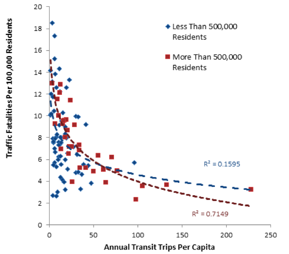 A 2014 study published in the Journal of Urban Health found that cities which increase transit mode share 1 percent can expect to reduce per capita traffic deaths 2.75 percent. APTA speculates that the effect is so large because high transit use is associated with other factors that also reduce risk — compact, mixed-use places shrink distances between destinations and enable people to reduce driving more than the amount that is directly replaced by transit.