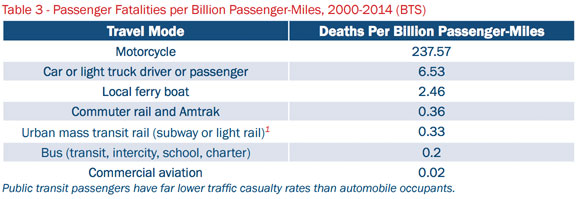 Riding transit is much safer than getting around in a car. According to APTA, the fatality risk per mile traveled for bus passengers is 30 times lower than car occupants. For rail passengers, the risk is 20 times lower.