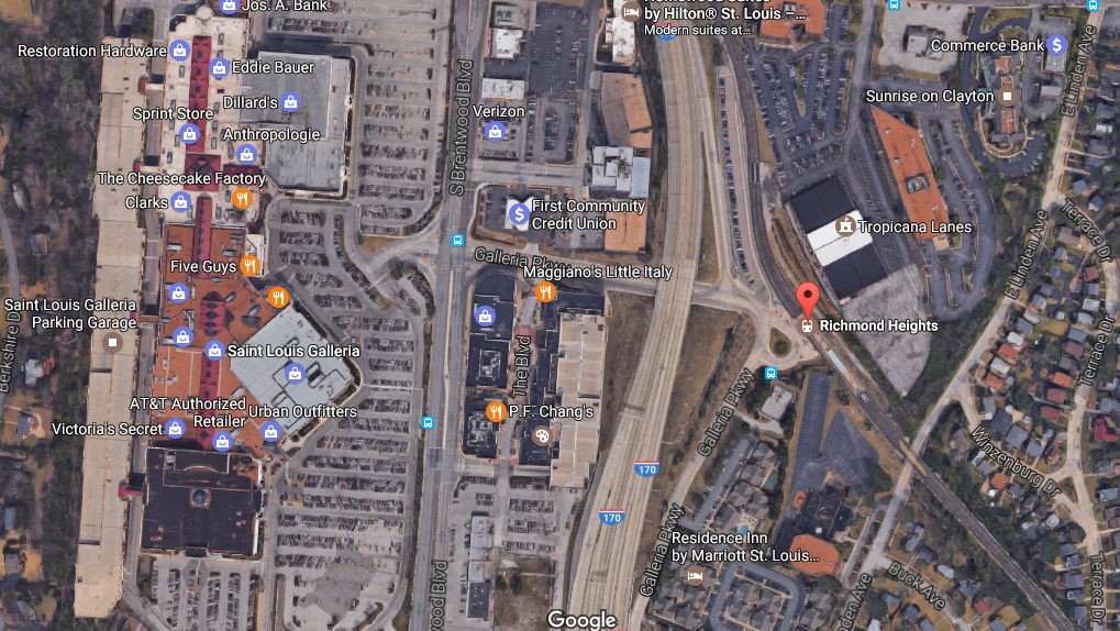 This suburban St. Louis light rail station overcame a downtown Sacramento parking crater in the first round of competition. There’s a great deal of retail nearby, but the stores are all configured to maximize driving access. People who take the train here have to trek through a hostile sea of parking to shop.