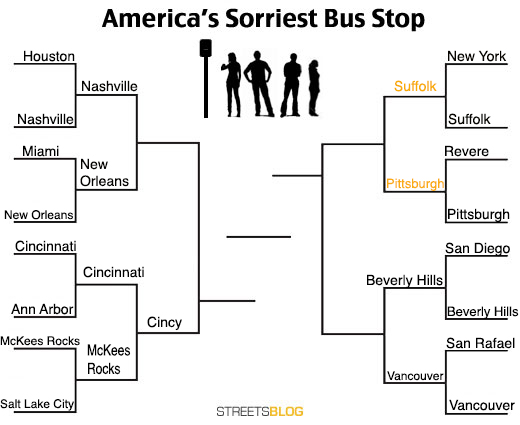 But first, an announcement: A very, very sad bus stop in Cincinnati has secured the first Final Four spot after trouncing McKees Rocks, Penn. Meanwhile, New Orleans is still duking it out with Nashville for the second spot, so vote early (but not often).