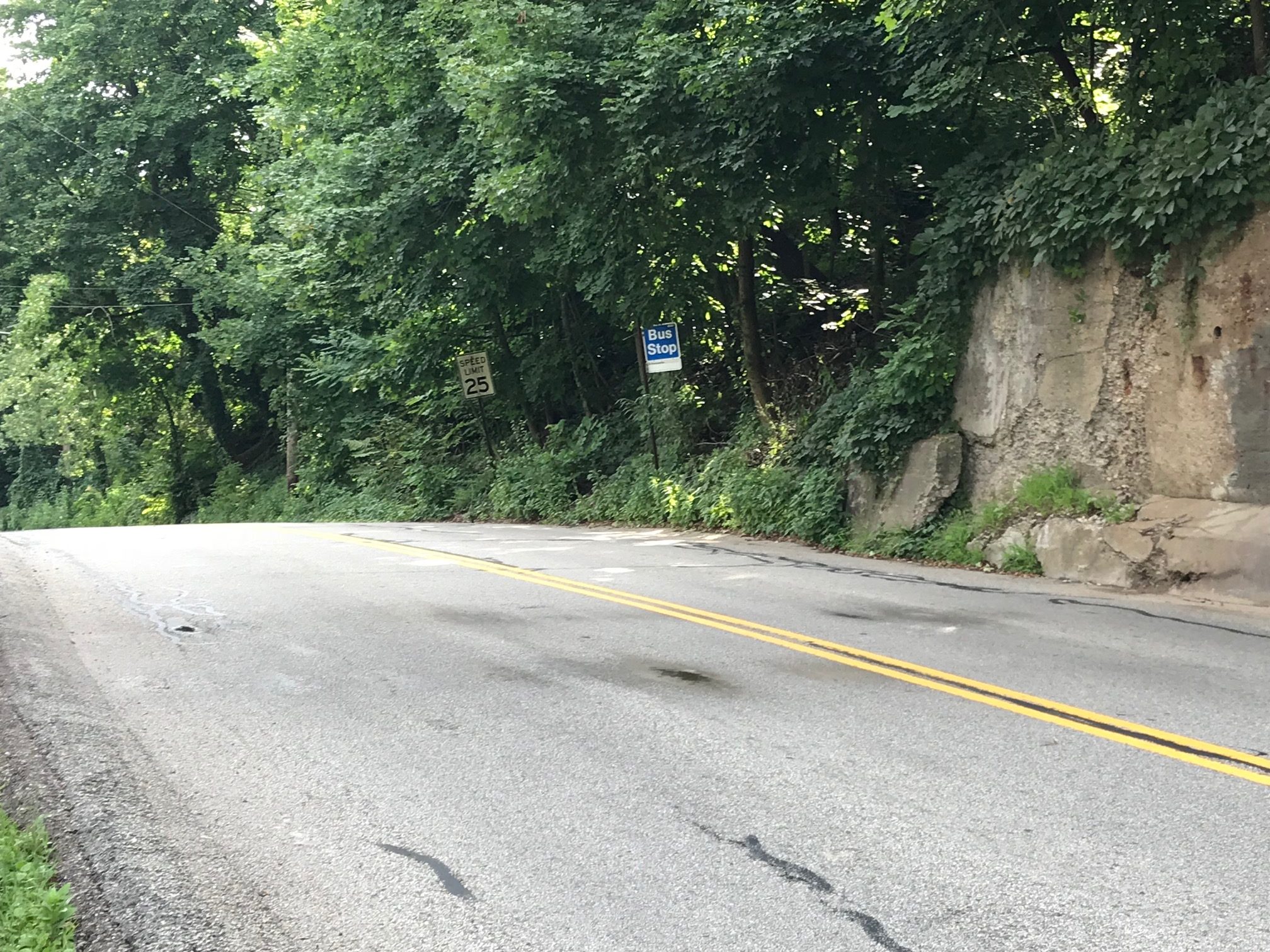 No sidewalk, no shoulder, no curb, not even flat ground. Just an overgrown hillside. Absolutely nowhere to stand other than in the road. It’s located at the crest of a blind hill so no oncoming traffic (or arriving buses) can see you there until they’re right on top of you. To add insult to injury it’s at a spot where the road narrows under a bridge so there is even less margin for error for traffic to pass by.