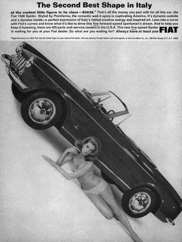 But with the rising popularity of NASCAR in the 1950s, the tone of car ads took a hard left turn away from the dependable family sedan and towards athletic performance and sleek individualism. The aspirationally gorgeous stay-at-home mom was suddenly forced out of the carpool-lane driver’s seat — and she was replaced with … this other aspirationally gorgeous lady taking a bikini nap on the garage floor for some reason!