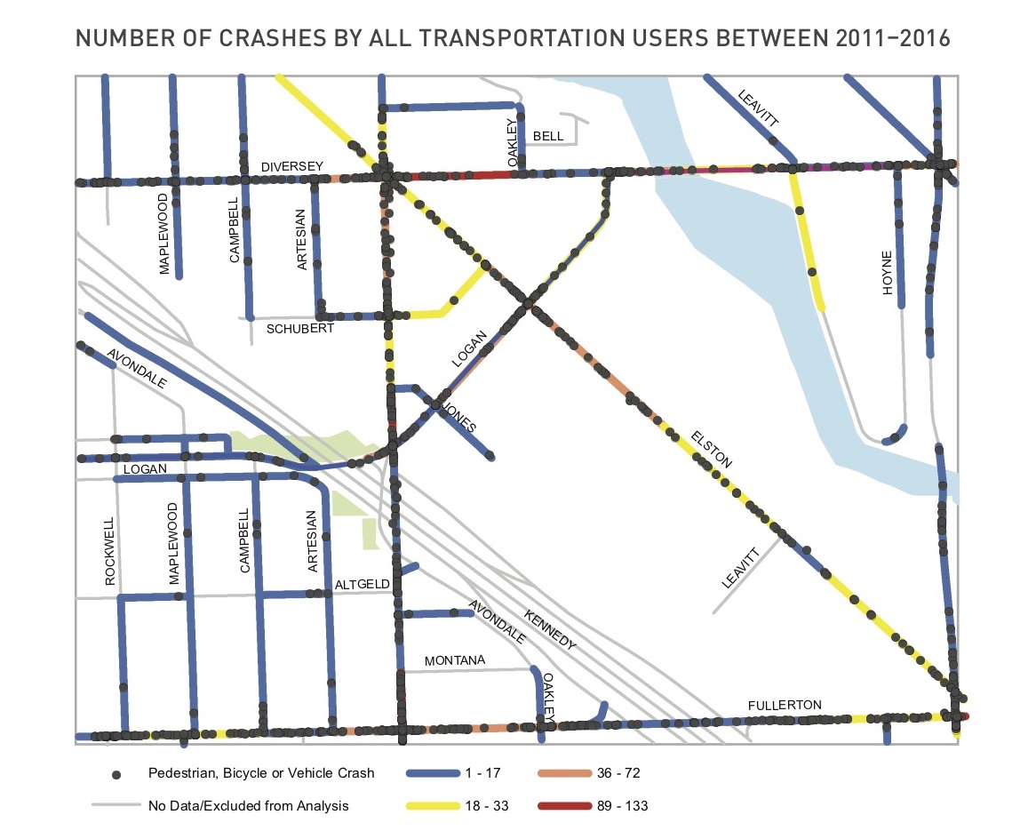 In November 2018 ATA released the report Reimagining Logan Boulevard to Lathrop Homes highlighting feedback collected and also offering recommendations for the area. According to the report, this stretch of Logan is a high-crash area for pedestrians, bike riders, and drivers alike. Between 2011 and 2016, the study area saw 48 pedestrian crashes, 70 bike crashes, and 1,707 motor vehicle crashes.