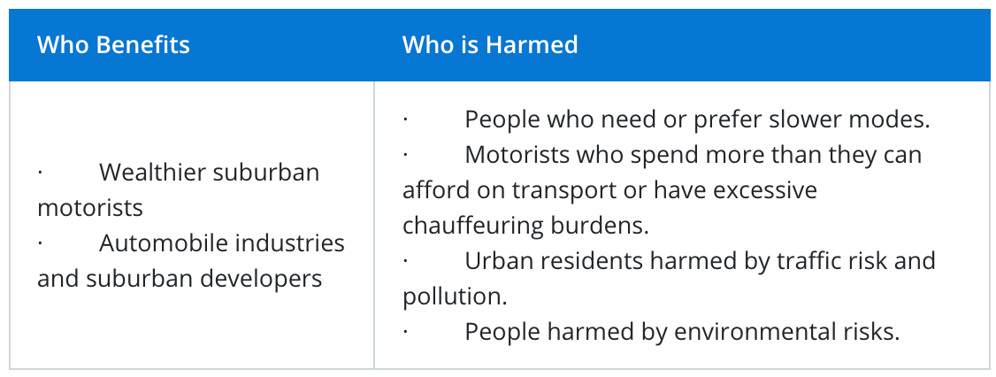 - Social equity impacts including underinvestment in slower modes, harms that faster modes impose on slower modes, and impacts on disadvantaged groups. The table below indicates groups that benefit or are harmed by speed-prioritizing planning.