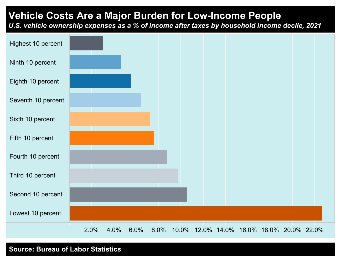 In a recent study from Inequality.org that was re-published by Streetsblog, researchers found that “for the poorest 10 percent of U.S. households, the share of after-tax income going to vehicle costs (22.6 percent) is 7.5 times as large as the share spent on vehicle costs by the richest 10 percent” — and that wasn’t accounting for all the money that diverted from those households’ taxes to pay for the societal costs of driving.