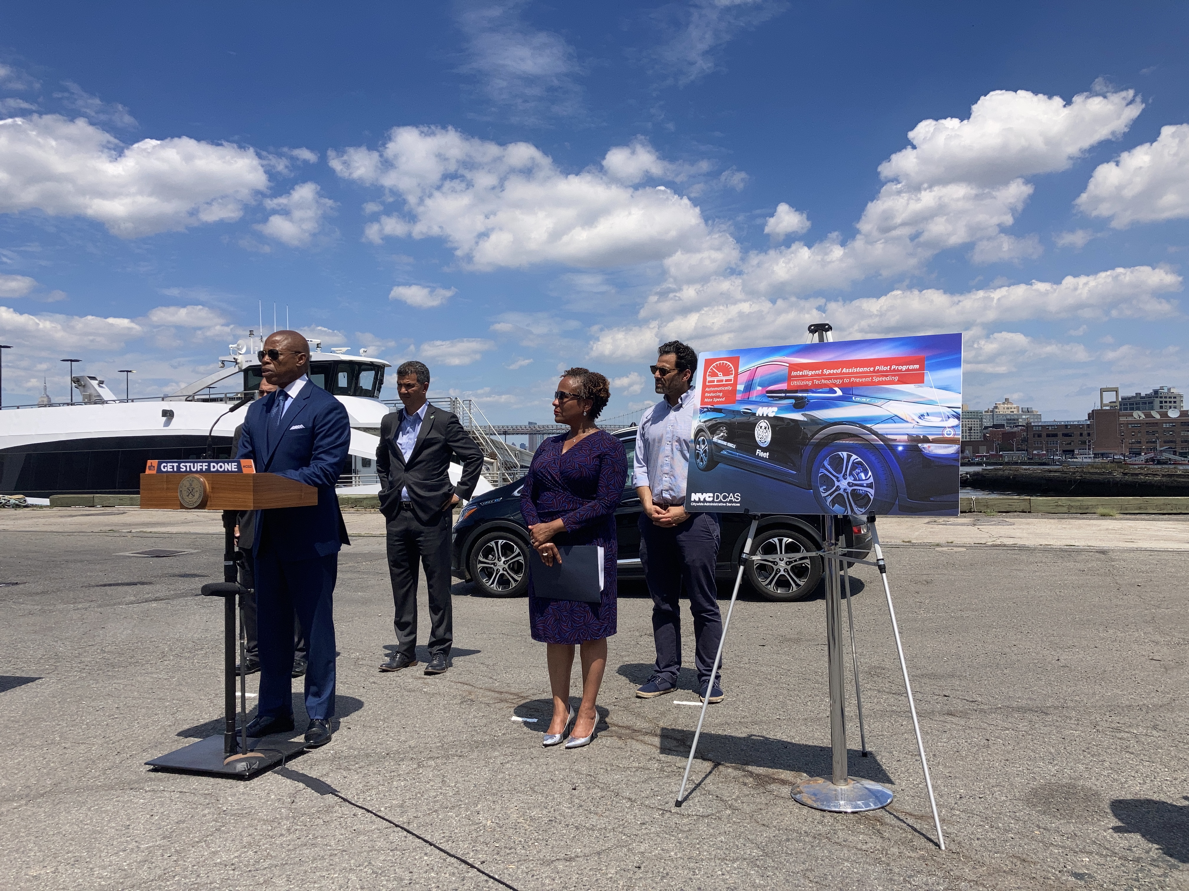 “We are urging New Yorkers to slow down, so we have to start with our fleets first,” Adams said at the Brooklyn Navy Yard as he stood next to a city vehicle equipped with the new technology. “Clearly you see the correlation between these injuries and fatalities are connected to aggressive, fast driving — we want to make sure we lead from the front. Exempted currently from this technology are emergency vehicles and my vehicle at this time.”