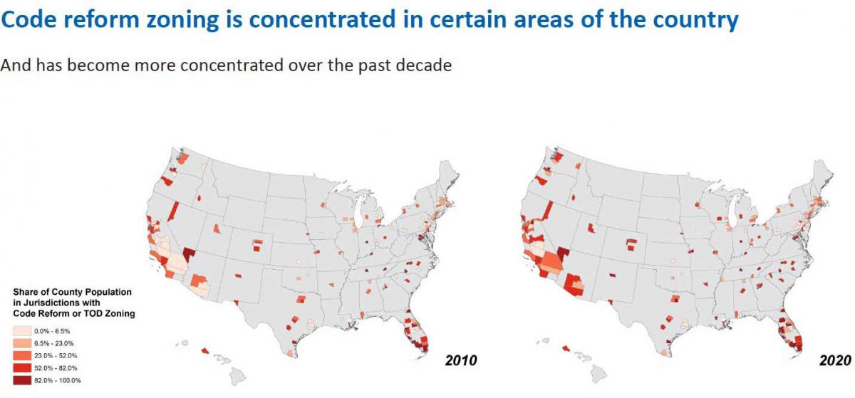 - Code reform is most prevalent in the South and West. Pockets of the Northeast and Midwest are getting zoning reform. The prevalence in the South would not be surprising to those who know the history of the New Urbanism and the early codes that were adopted in Florida and the Gulf Coast. Parts of the US with relatively low population, such as the northern Great Plains states, were not included in the study.