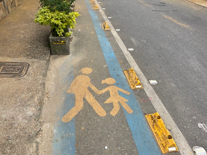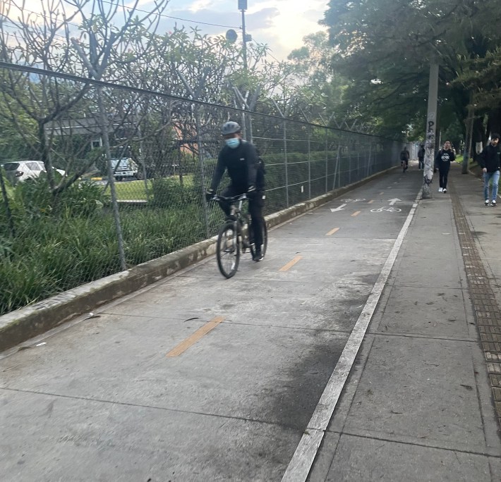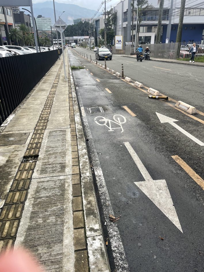 It’s important to remember, though, that Colombia is not a wealthy country — its 2021 GDP was $3.14 billion, slightly less than the state of Connecticut, which has just 1/14 of the Colombia’s population — and it manages to do a hell of a lot more than most American cities I’ve visited with relatively little. That includes a fascinating mix of both drool-worthy off-road paths, on-road lanes buffered by planters, armadillo humps, or plastic jersey barriers, and even more informal routes that double as sidewalk extensions, like this one in Medellín’s Poblado neighborhood: