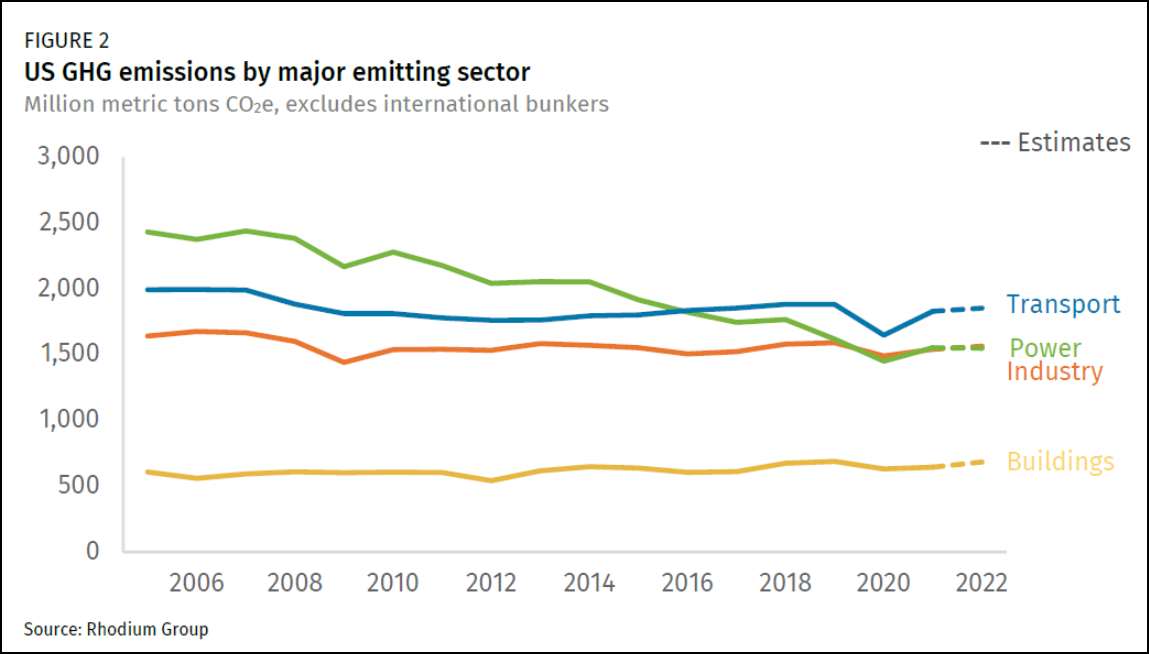 According to preliminary estimates from analysts at the Rhodium Group, overall greenhouse gas emissions increased 1.3 percent between 2021 and 2022, thanks in part to a parallel 1.3-percent increase in the transportation sector driven by a combination of increased jet fuel demand and steady consumption of gasoline in passenger cars. The transport sector once again outranked power, building and heavy industries for the title of the dirtiest segment of the U.S. economy, as it has since 2016.