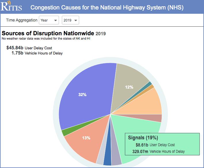 According to those University of Maryland estimates, time lost sitting at traffic signals amounts to 329 million vehicle hours of delay, and costs us $8.6 billion dollars per year. They estimate that time spent waiting at traffic signals is roughly three-fifths as great as the 561 million vehicle hours of delay associated with routine “recurring” traffic congestion.