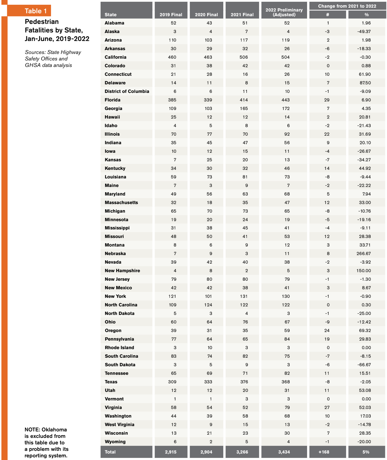 U.S. drivers killed 3,434 people on foot in the first six months of 2022, an increase of 5 percent over the same period the prior year — and a staggering 18 percent increase over the number of walkers who died in early 2019, the last year before the pandemic, according to the latest fatality estimates from the Governors Highway Safety Association.