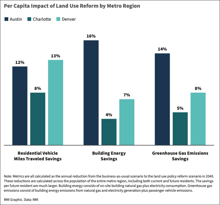 “A lot of people have an intuitive understanding that compact places are low-carbon environments, but policymakers [don’t know] exactly what kinds of reductions they can expect if they reform these policies that functionally mandate disconnected communities,” explained Ben Holland, manager at RMI and a lead author of the report.