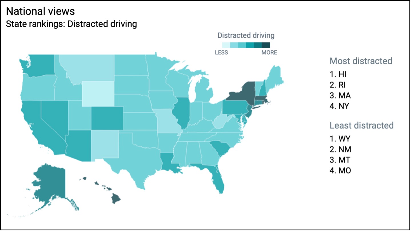 The results, at first, might seem pretty shocking. Among the least distracted drivers in the nation were Wyoming, which allows teenagers with graduated drivers licenses to use phones behind the wheel, and New Mexico, which has also ranked as the state with the highest number of reported distraction-related crashes for the last three years in a row. Those two states were followed by Montana and Missouri, despite being two of only three states in the nation not to make texting behind the wheel illegal. (The third is Nebraska.)