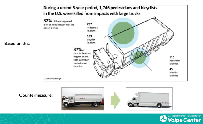 In an extensive May 19 letter to NHTSA, Brumbelow noted that an average of 53 bicyclists or pedestrians are killed each year when they’re swept under the wheels of a truck, in addition to 52 motorcyclists, who were also excluded from NHTSA’s analysis.