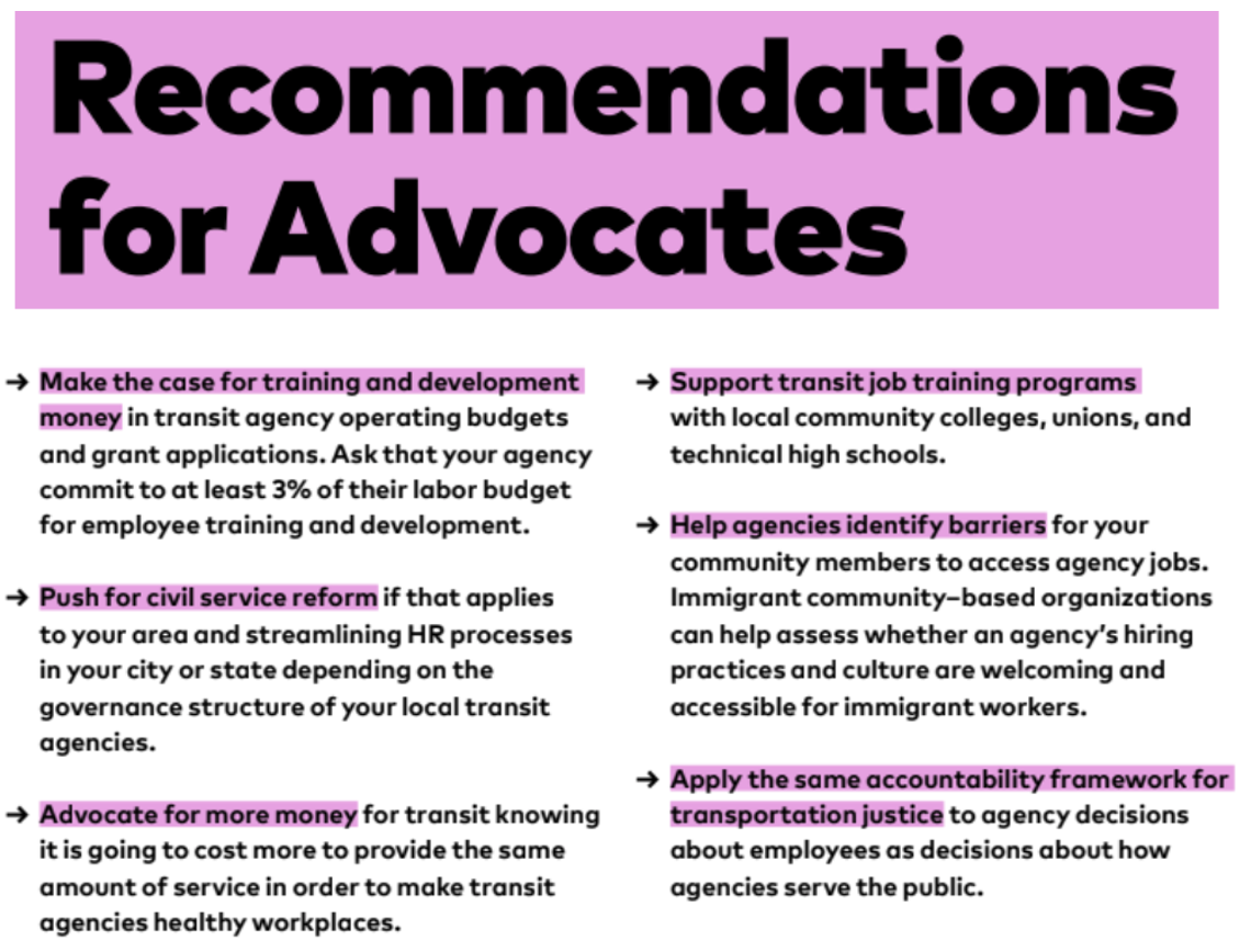 The Transit Center report cautioned advocates that turning transit agencies into great workplaces may not result in more on-time buses on the streets and well-maintained trains on the rails — at least not immediately. It will, however, build a strong foundation without which the sustainable transportation ecosystem can’t possibly be expected to thrive, and without which many agencies are struggling to simply survive.