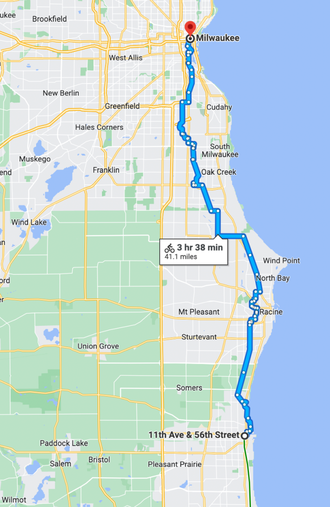 In the meantime, if you need to transport a bicycle between Chicago and Milwaukee and you enjoy bike touring, here’s an alternative to boxing your cycle or driving that’s pretty fun. Take your bicycle on Chicagoland’s fairly bike-friendly Metra commuter railroad’s Union Pacific North line to its Kenosha, WI, terminus, and then bicycle a few hours to downtown Milwaukee.