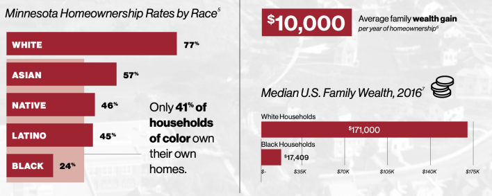 Armstrong is correct that Black and brown Minnesotans have some of the lowest rates of homeownership relative to their white neighbors in the nation — and the reasons why stem from racist policies like red-lining and eminent domain that razed neighborhoods of color for highways, gutting the intergenerational wealth of countless families in the process. Gladney questions the idea, though, that simply allowing developers to build multifamilies in more places would somehow result in a net loss of single-family homes — or that keeping existing neighborhoods under glass would mean BIPOC communities could someday buy in.