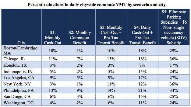 TDM strategies can have a huge impact on reducing congestion if implemented. A recent study of nine major cities found that strategies such as replacing parking subsidies with a daily $5 non-single-occupancy vehicle benefit could reduce vehicle miles traveled during the daily commute by as much as 36 percent.