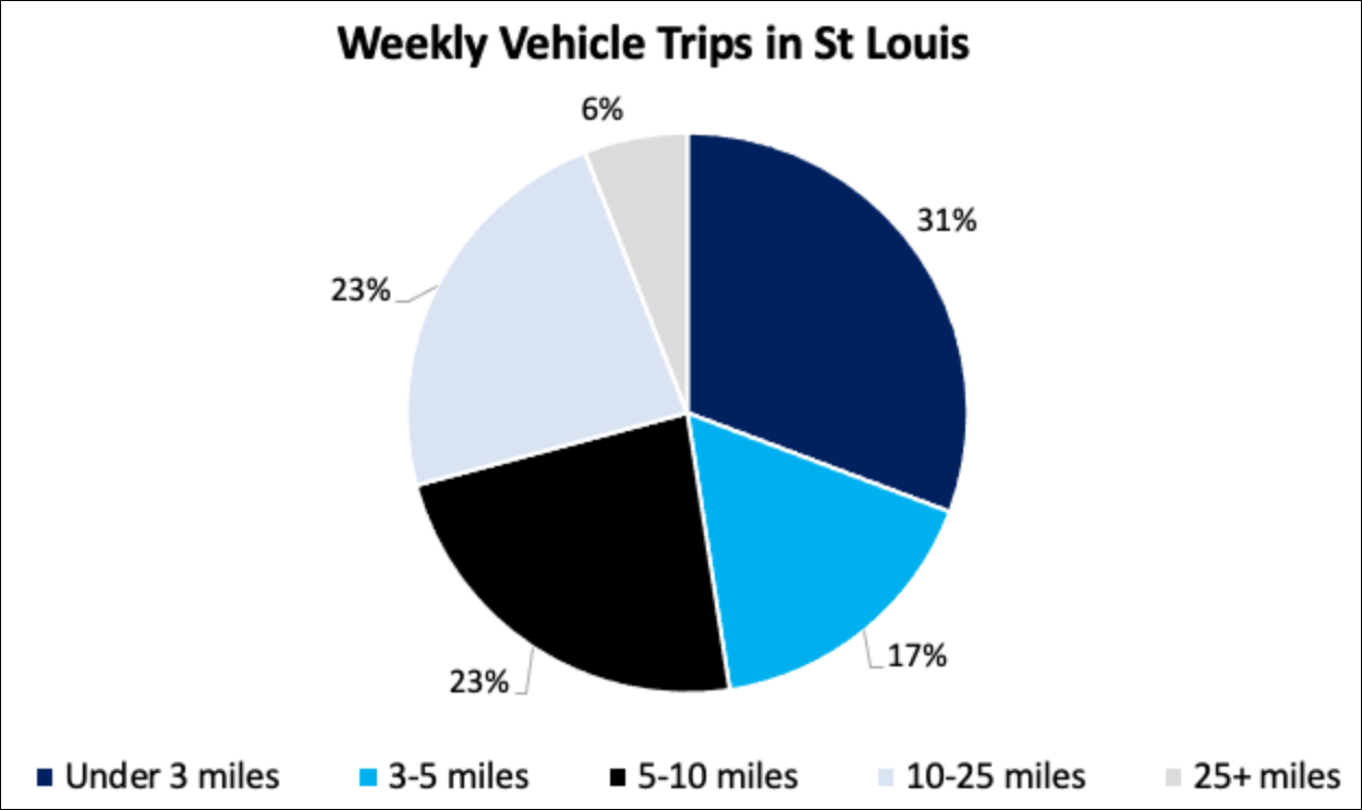 To prove the doubters wrong, Grunwald drew on dozens of studies as well as insights from big-data mobility firm Replica to allows users to select their unique city from a simple drop-down list, and see at a glance how many short car trips are best primed to be replaced with e-bike rides — and what would happen in they were. In my home city of St. Louis, for instance, a stunning 48 percent of car journeys are under five miles, a distance that’s a little bit less than the amount the average e-biker rides every day.