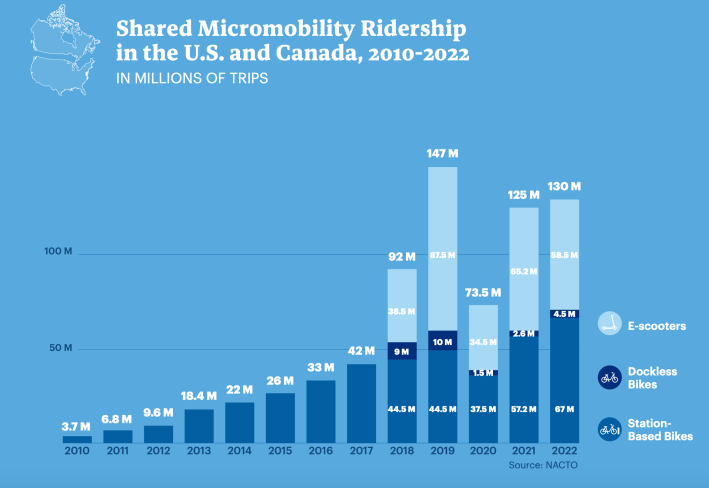 NACTO’s recently published annual micromobility report showed that docked bikeshare just had its best year in history, roaring back from pandemic-era lows and eclipsing last year’s record-setting trip numbers with reported 71.5 million journeys across U.S. and Canada in 2022. Dockless bike and scooter-share, meanwhile, is being praised for finally “growing up” from its “Wild West” days of dumping fleets onto city streets overnight and into mature partnerships with municipalities, which increasingly view their product as an essential component of the sustainable transportation ecosystem.
